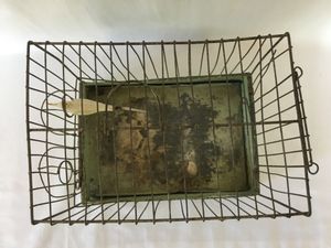 Dør på den ene siden og to "stativer" utvendig til mat og vannskåler. Kan også henge.